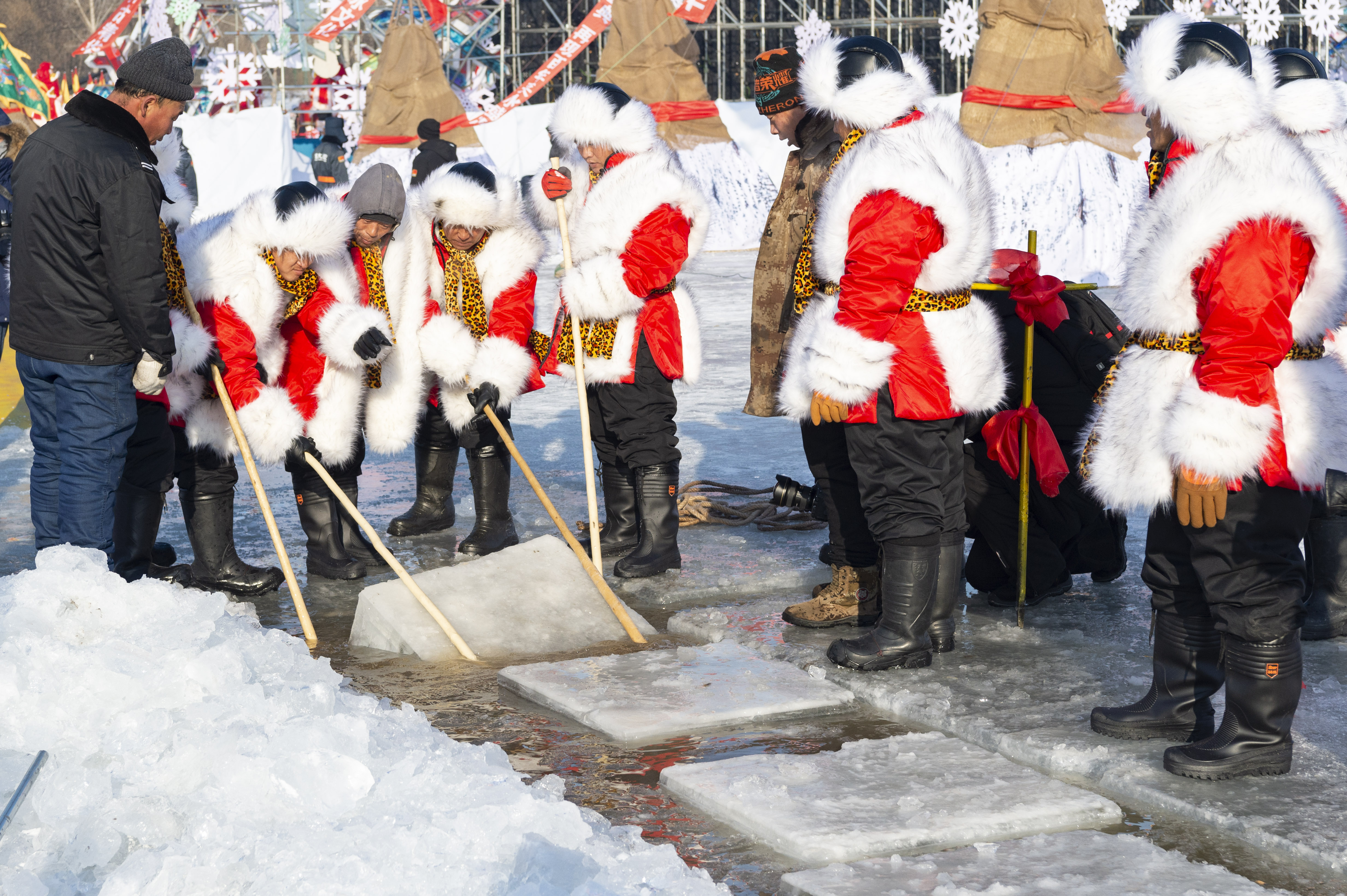 12月7日,人们在采冰节现场采冰。