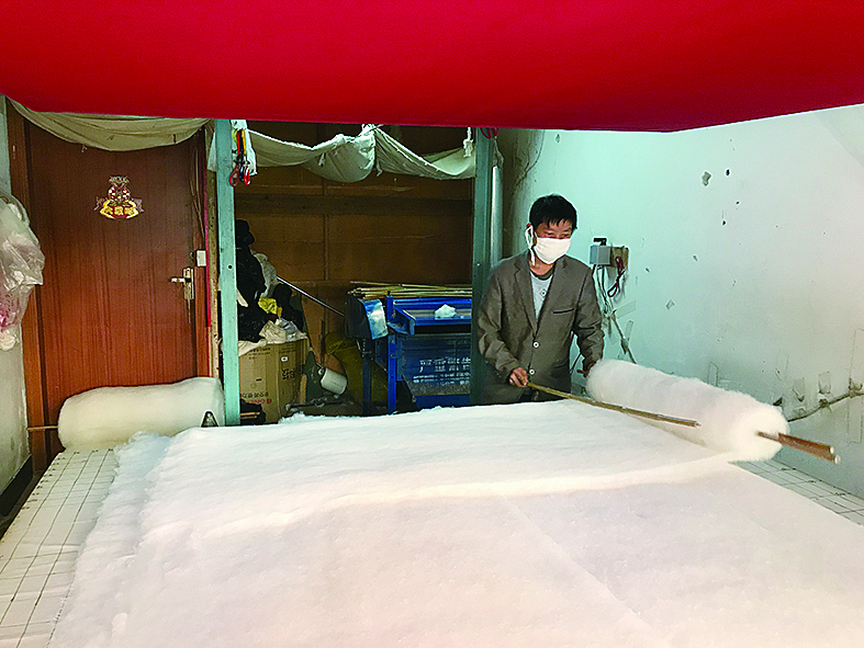 “不急吧?今天活有点多,明天下午来拿,行不?”吴师傅俯着身,在案板上铺完棉花,正赶着包网纱。这阵子,他每天早上6点多起来吃早餐,7点左右开工,要赶到晚上11点,才能赶完十几床棉被。