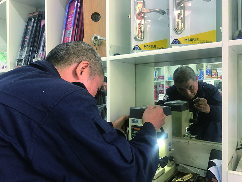 老彭咬牙买下第一个自动锁式复制机。打开机上的照明灯,把新钥匙片和旧钥匙模具夹稳夹好;接着,按下动力按钮,等待刀片经过两片钥匙,切削、吻合它们凹凸;最后取下钥匙,用锉子打打毛刺。这套过程以前要30分钟,现在不用2分钟。