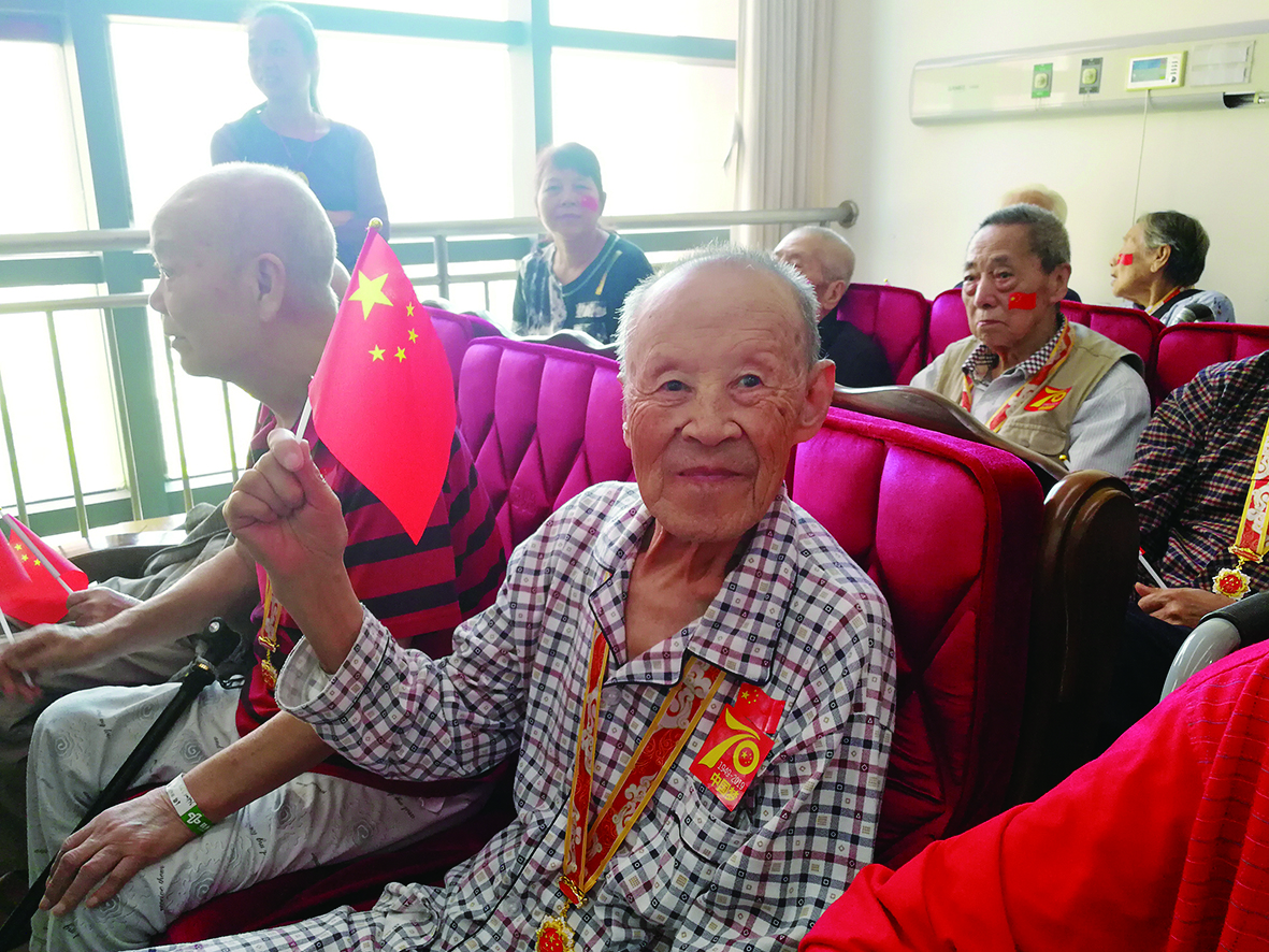 ▲今年国庆节,陈老在医院看阅兵,胸前佩戴“庆祝中华人民共和国成立70周年”纪念章 受访家属供图