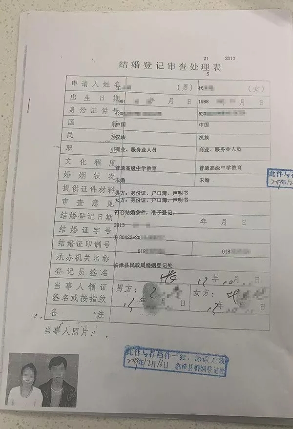 ▲冒用者用代女士身份证在临漳县民政局进行婚姻登记,材料齐全