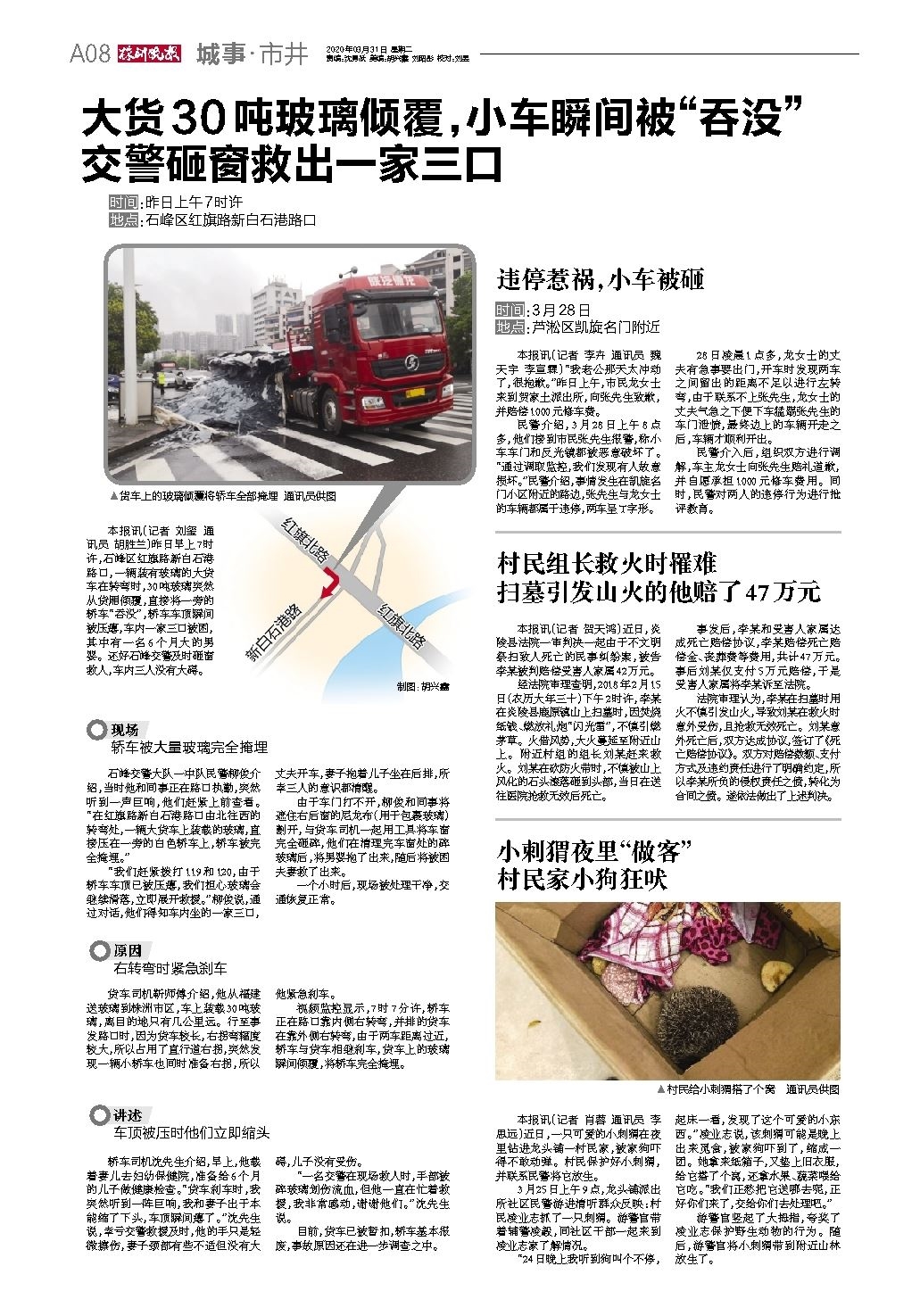 大货30吨玻璃倾覆,小车瞬间被“吞没” 交警砸窗救出一家三口