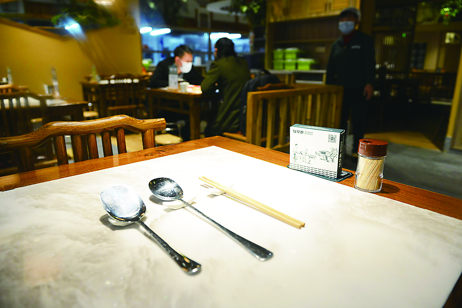 ▲3月23日,河西步步高绿草地餐饮店,工作人员在客人来就餐前就已经在桌子上摆好了公筷公勺