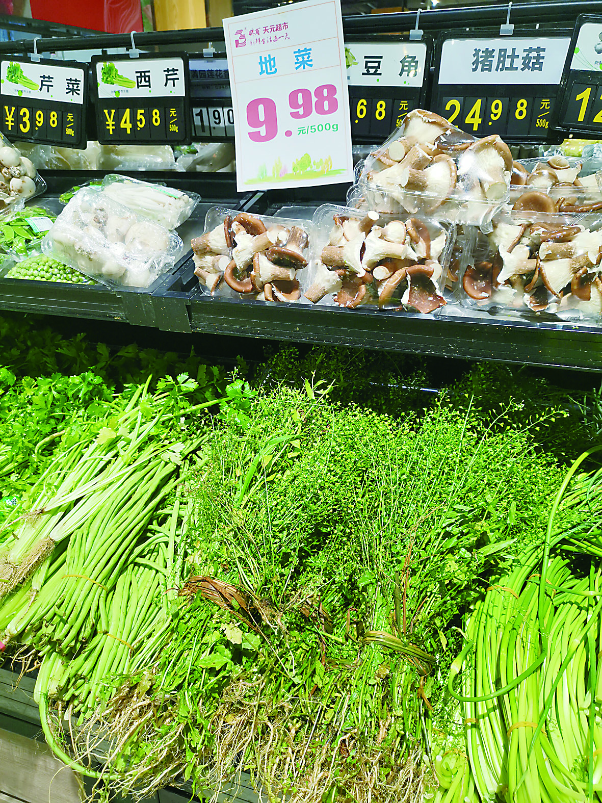 ◀超市蔬菜区,地菜被摆放在显眼位置 记者 戴凛 摄