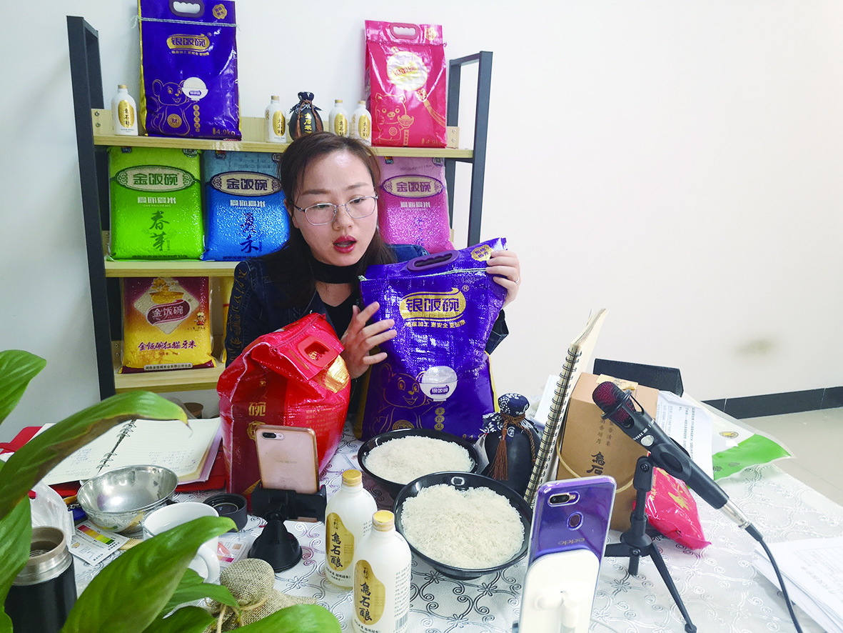 ◀主播正在多个平台直播销售金饭碗米业的产品 记者 成姣兰 摄