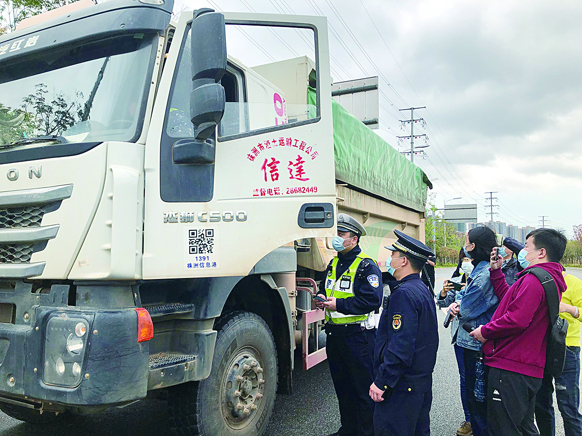 ▲执法人员在对渣土车进行检查 记者 刘玺 摄