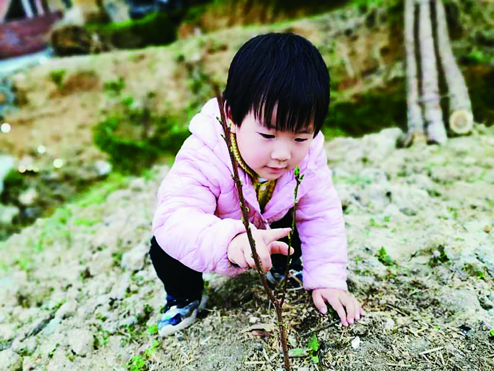 两岁五个月的伊伊,在爷爷的黄桃园里发现了“春天”。每一个叶芽她都想触碰,还说“帮你洗个澡哈,我保护你”。