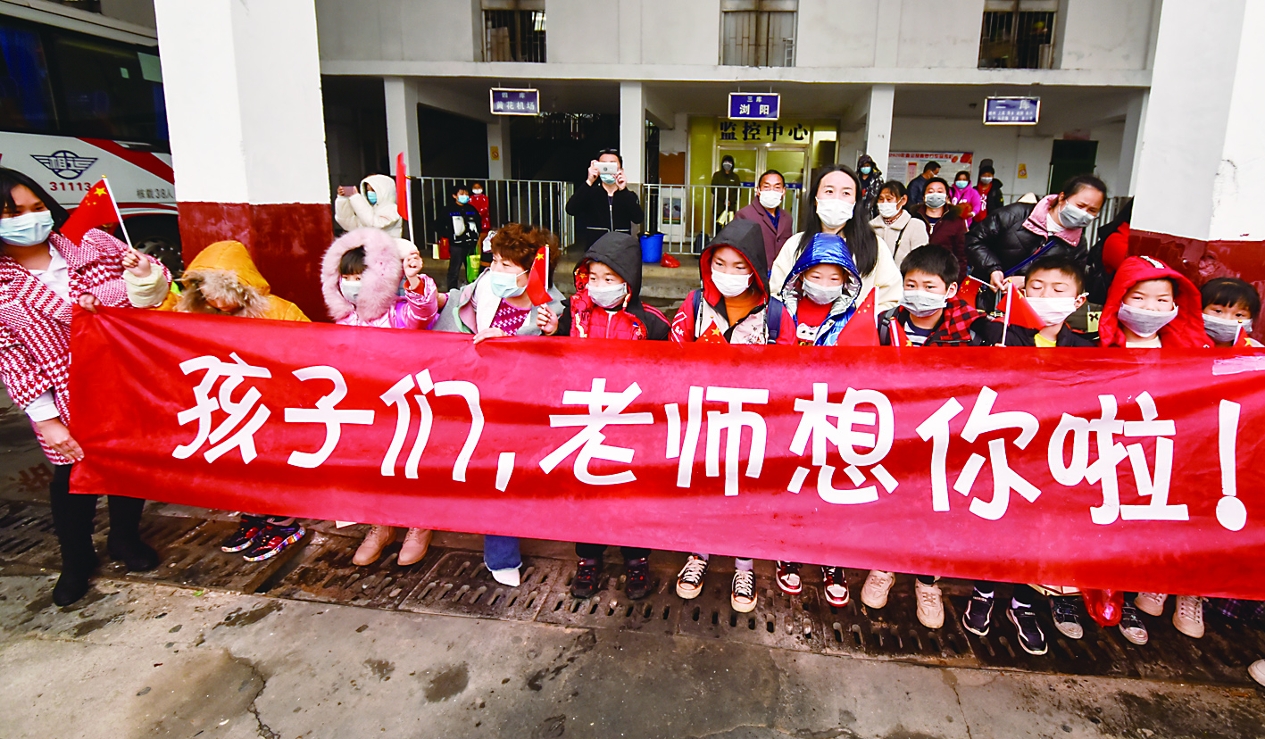 商业街上,芦淞区教育局、龙泉街道办、栗树山小学等单位的工作人员举着 “欢迎回家”“株洲欢迎你”“爱心守望·情暖湘鄂”等横幅迎接大家。