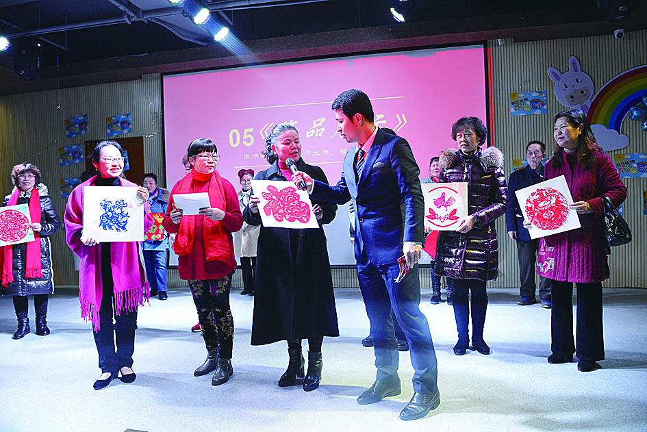 ▲剪纸班学员在株洲晚报老年大学2019年春节联欢会上展示自己的作品