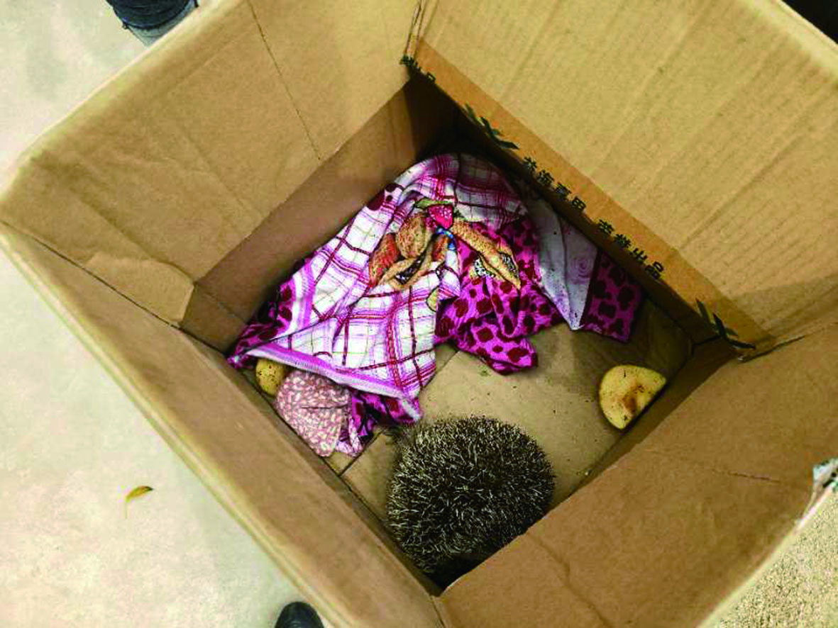 “24日晚上我听到狗叫个不停,起床一看,发现了这个可爱的小东西。”凌业志说,该刺猬可能是晚上出来觅食,被家狗吓到了,缩成一团。她拿来纸箱子,又垫上旧衣服,给它搭了个窝,还拿水果、蔬菜喂给它吃。“我们正愁把它送哪去呢,正好你们来了,交给你们去处理吧。”