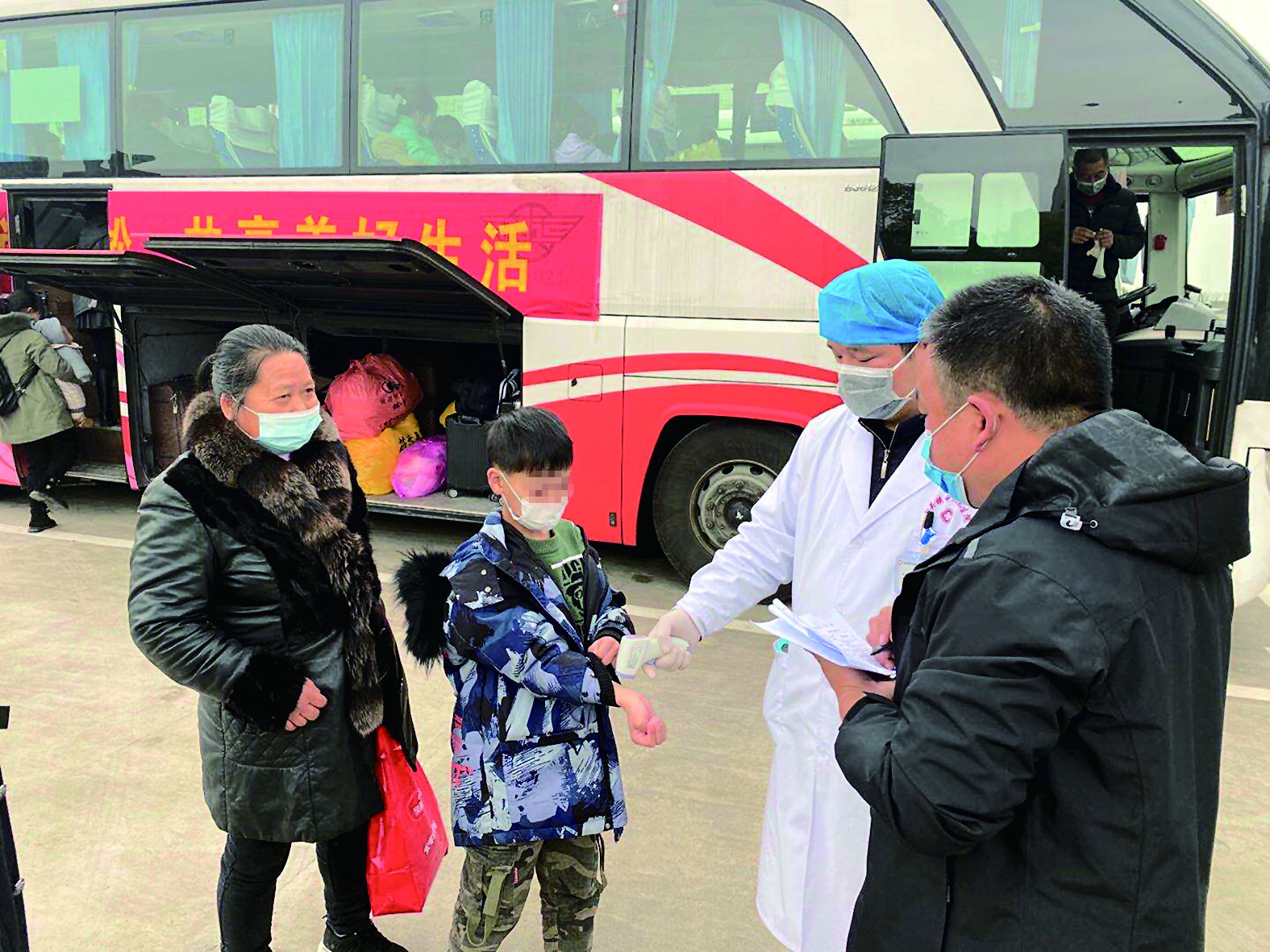 在专车接送站点,返岗人员依次排队登上“返岗爱心专车”。上车前,复工复学人员需经跟车医护人员逐个全面完成消毒、实名登记、核实身份证、体温监测等防疫措施,并通过居民健康卡二维码扫码确认无异常情况。考虑路途遥远,芦淞区还专门提供了“三送服务”:一是送温暖,为复工复学人员提供牛奶、矿泉水、面包等随行食品;二是送健康,为复工复学人员配备口罩、手套、酒精等防护用品;三是送政策,由人社、卫健、教育等部门综合整理,为复工复学人员发放芦淞区惠民政策宣传单。