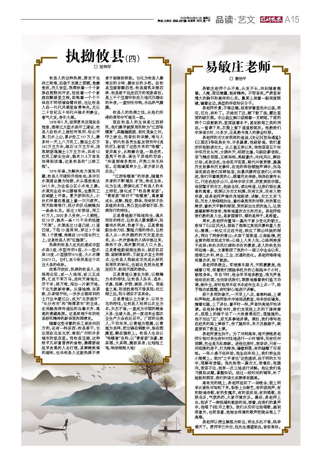 易老师的古文有很深的造诣,《史记》《资治通鉴》《三国志》等经典史书,许多篇章,他能背诵。我们喜欢听他朗读古文。从三皇五帝以来,浩浩荡荡五千年中华历史长河,女娲补天,昭君出塞,勾践卧薪尝胆,岳飞精忠报国,王侯将相,英雄豪杰,叱咤风云,醉卧沙场,成败安危,生命花开花落,朝代兴衰更替,篇篇历史故事和历史事件,在他的抑扬顿挫声调中,如鸟语花香在我们耳畔轻言,如暴风骤雨在我们心中响起,我们怀着滚烫的心,跟着历史神游,徜徉在黄河长江,行走在起伏山川,品味中华文明,欣赏美丽中国。佶屈聱牙的古文,他能念活,读出味道,让我们悟出真意和寓意。我原以为古文枯燥,没有文采,没有人物形象,经易老师声情并茂地朗读、讲解,古文文采飞扬,历史人物栩栩如生,像初春荒芜的田野,突然冒出嫩芽,像秋天平静的湖面,贸然跃出壮肥的鱼儿,让我感着新鲜和惊奇,渐渐地喜欢古文和历史。易老师给我们教的是人生,是家国情怀,播的是种子,是希望。