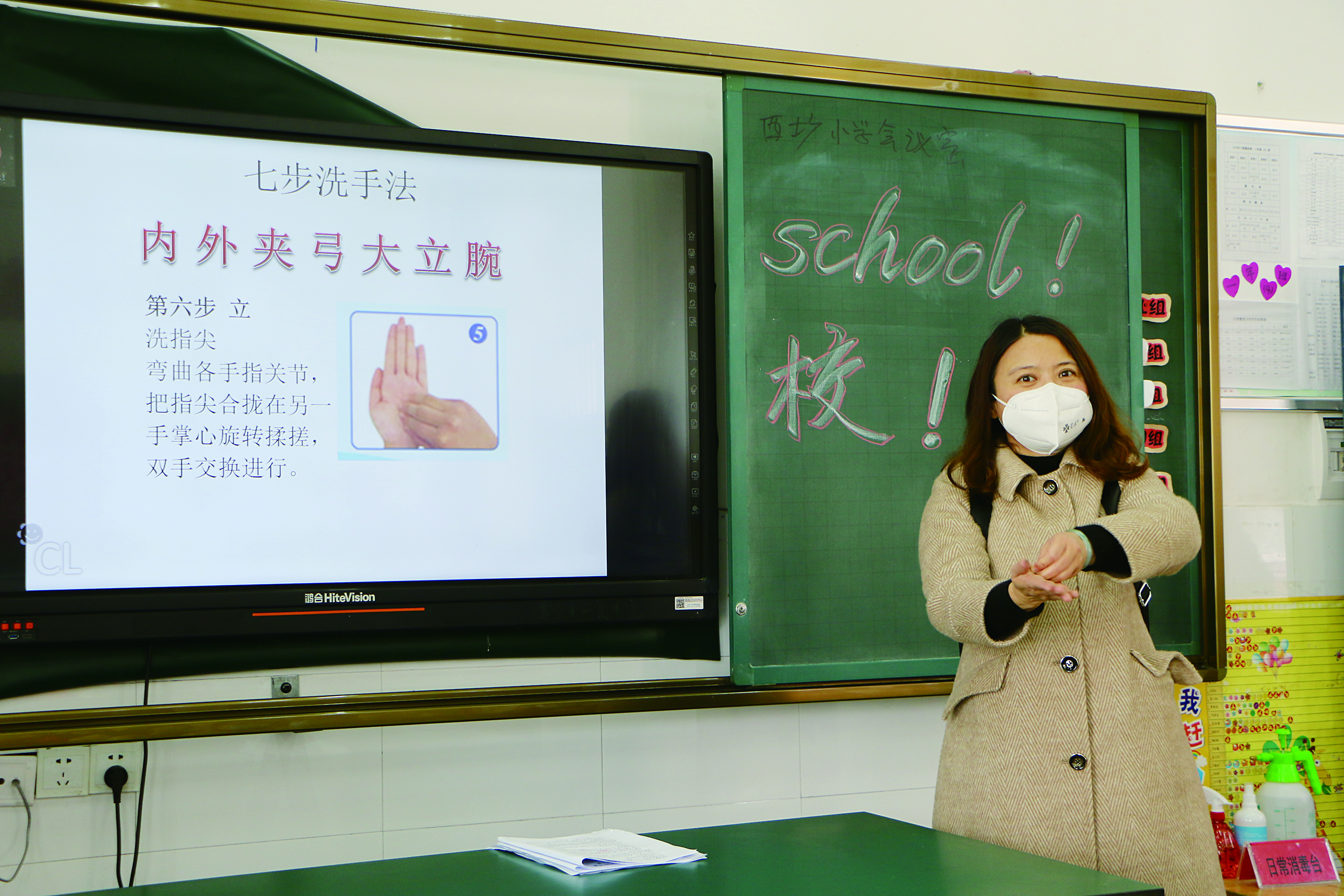 ▲长郡云龙实验学校云田校区演练活动中,一名老师在演示正确洗手方法 通讯员供图