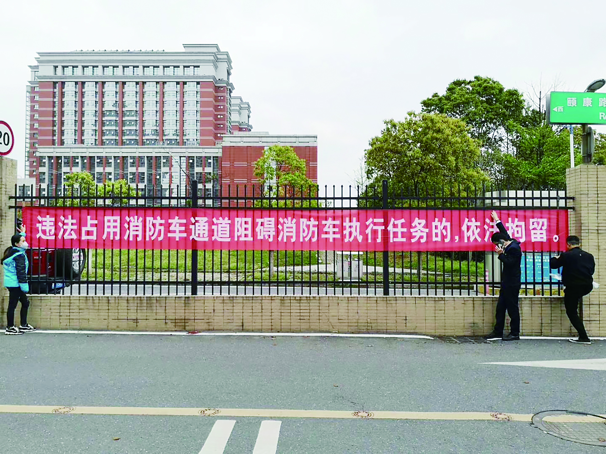 ▲昨天下午,中泰财富湘江小区在悬挂消防宣传标语 通讯员供图