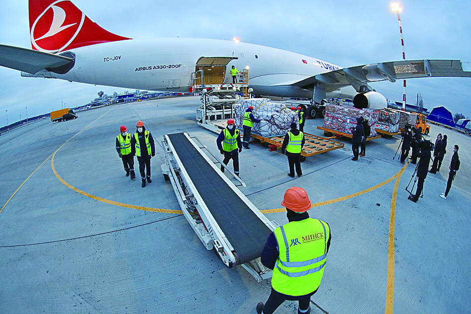 4月1日,在白俄罗斯首都明斯克国际机场,工作人员从飞机上卸下中国政府援助的人道主义抗疫物资。