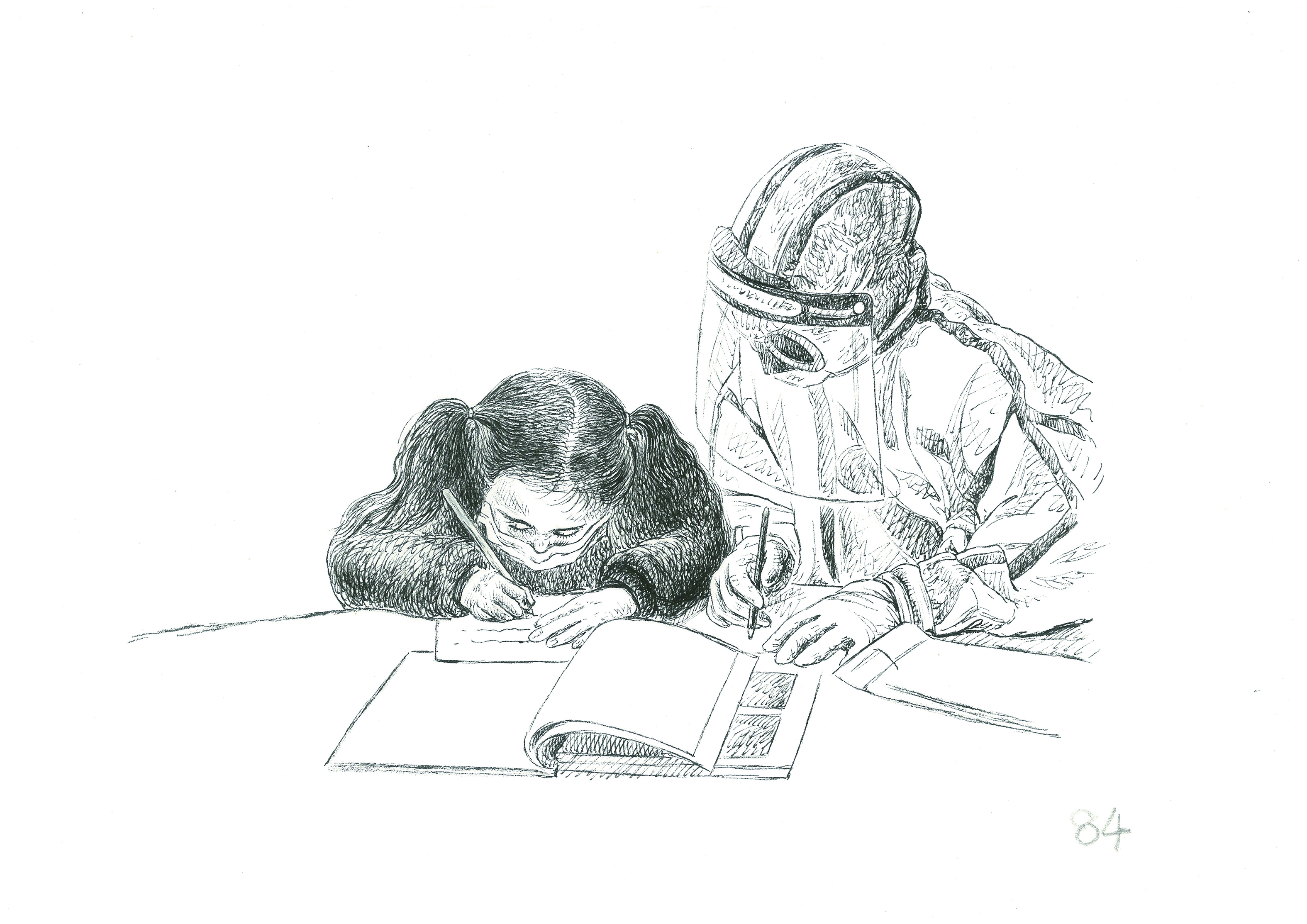 ▶医护人员辅导小女孩做作业 受访者供图