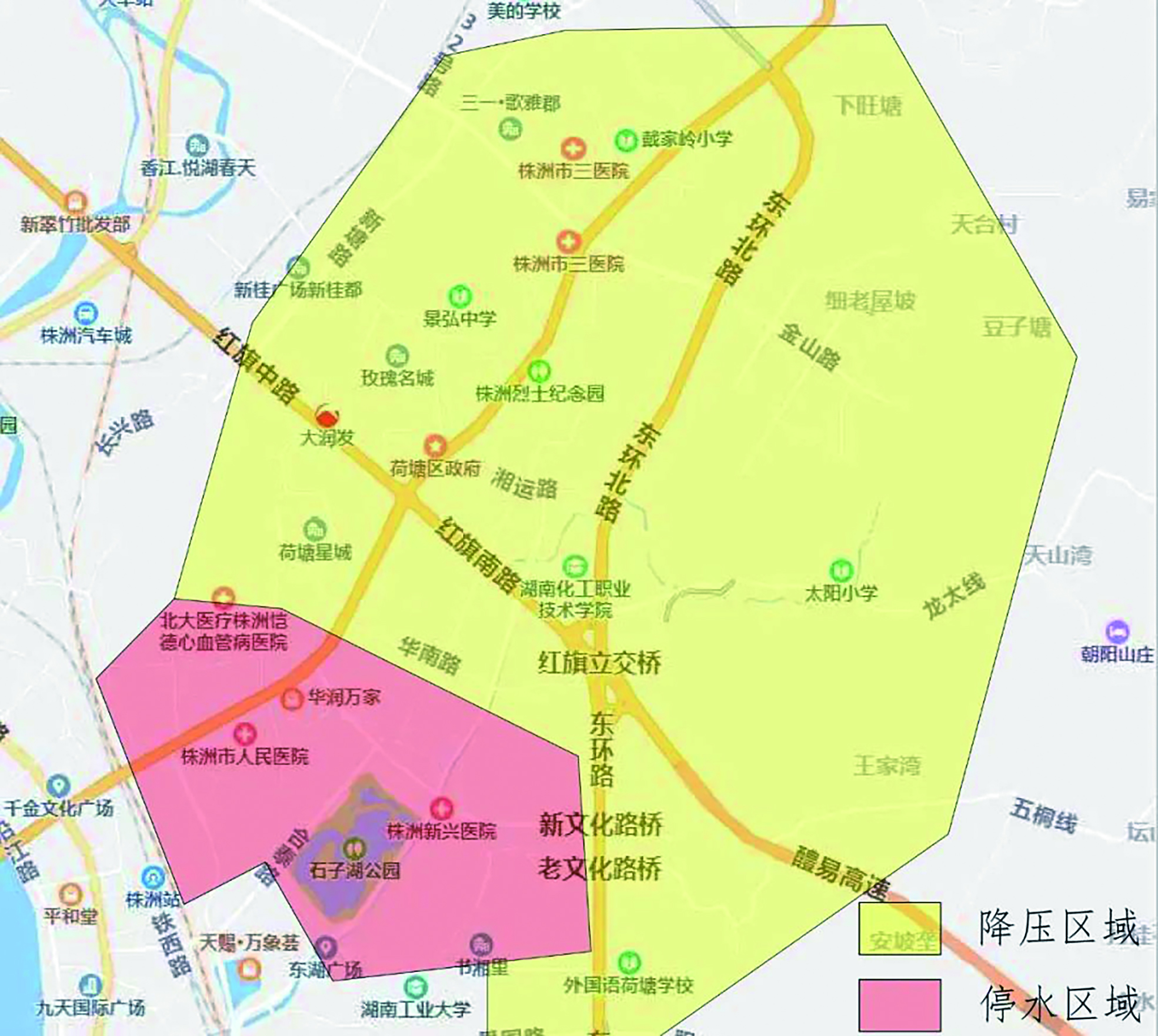 荷塘区大面积降压,主要包括新华西路(文化路口-红旗广场),新华东路(红旗广场-荷塘大道口)、新塘路、东环北路、东环线、红旗南路、华南路、金山路、新四路、桂花路、新苗路、湘运路、大坪路、水仙路沿线用户。