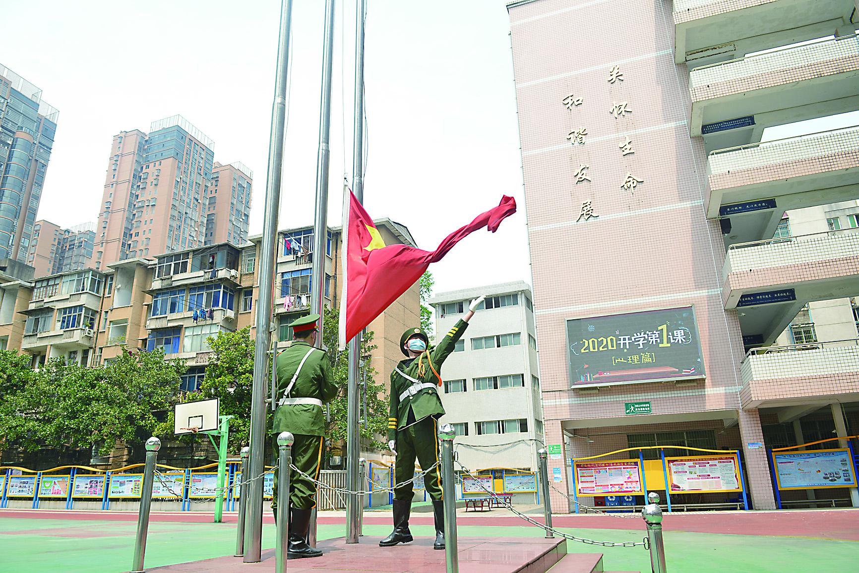 ▲昨日上午,贺家土中学,升旗仪式现场只有两名国旗手,学生们在教室起立,唱国歌