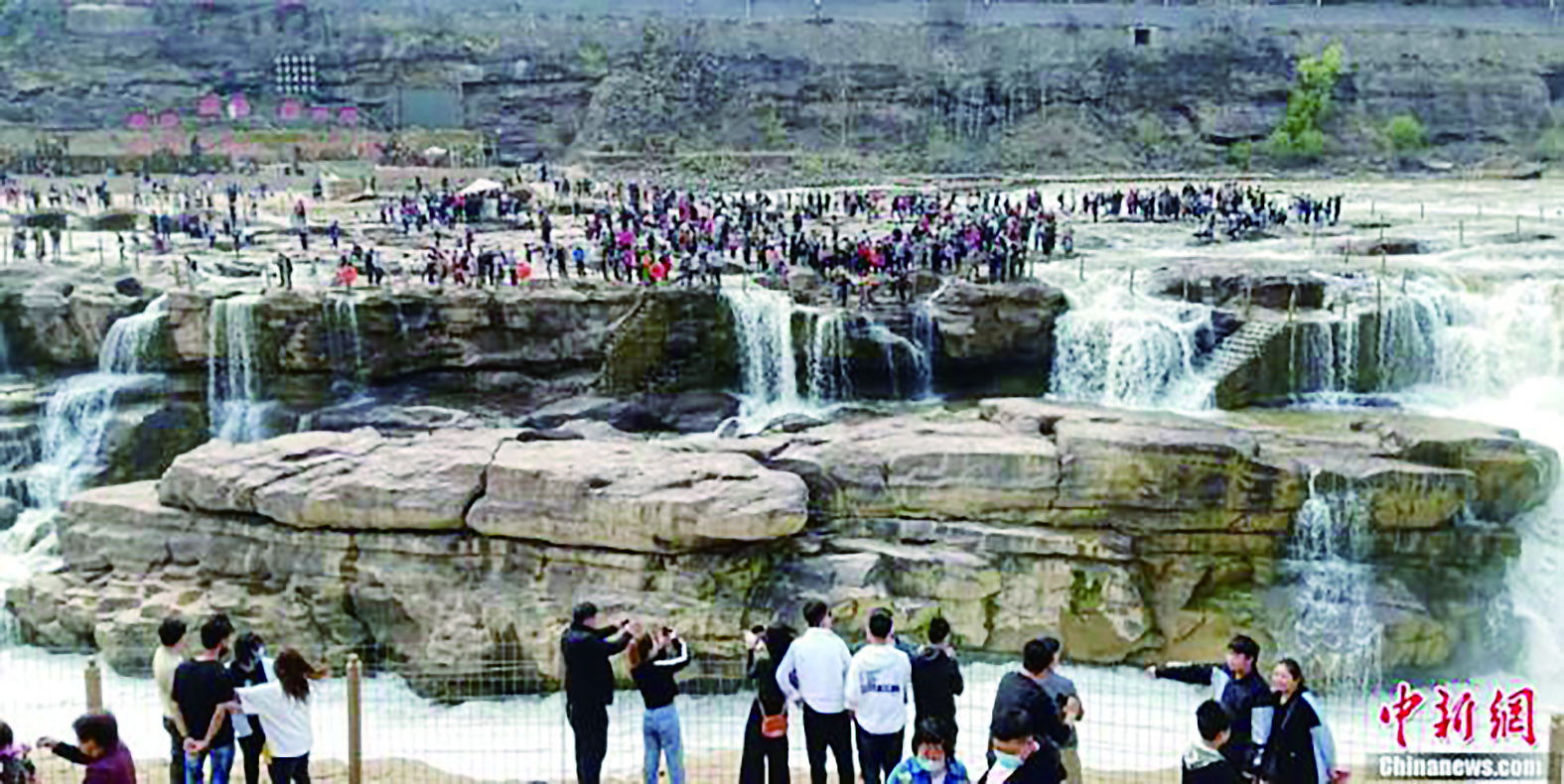 ▲4月5日,众多游客在山西吉县黄河壶口瀑布欣赏“桃花汛”