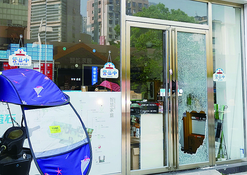 ▲店铺大门玻璃下方被砸出一个大窟窿 记者 戴凛 摄