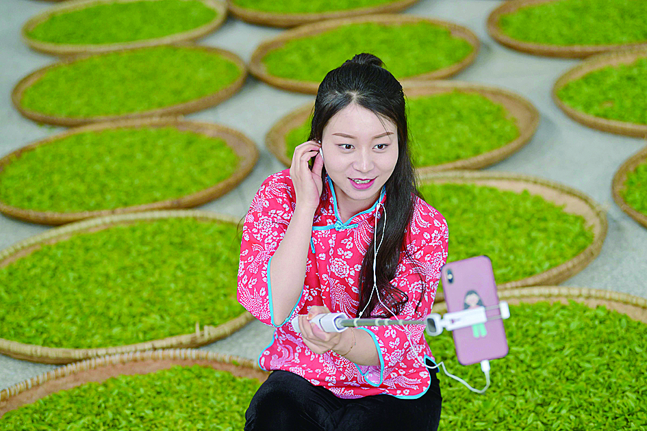 4月8日,鹤峰县鑫农茶业有限公司工作人员田玉妙通过直播介绍制茶过程。 为促进湖北省鹤峰县40万亩生态茶园的茶叶销售,近日,当地多家茶企积极与电商平台对接,通过直播的方式,向消费者直观呈现茶叶采摘到生产制作的全过程,助力“带茶出山”,帮助茶农脱贫增收。 (据新华社)
