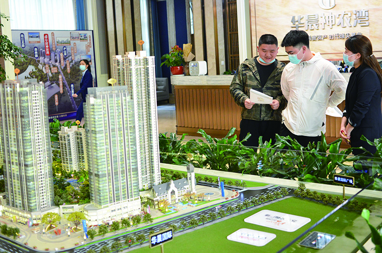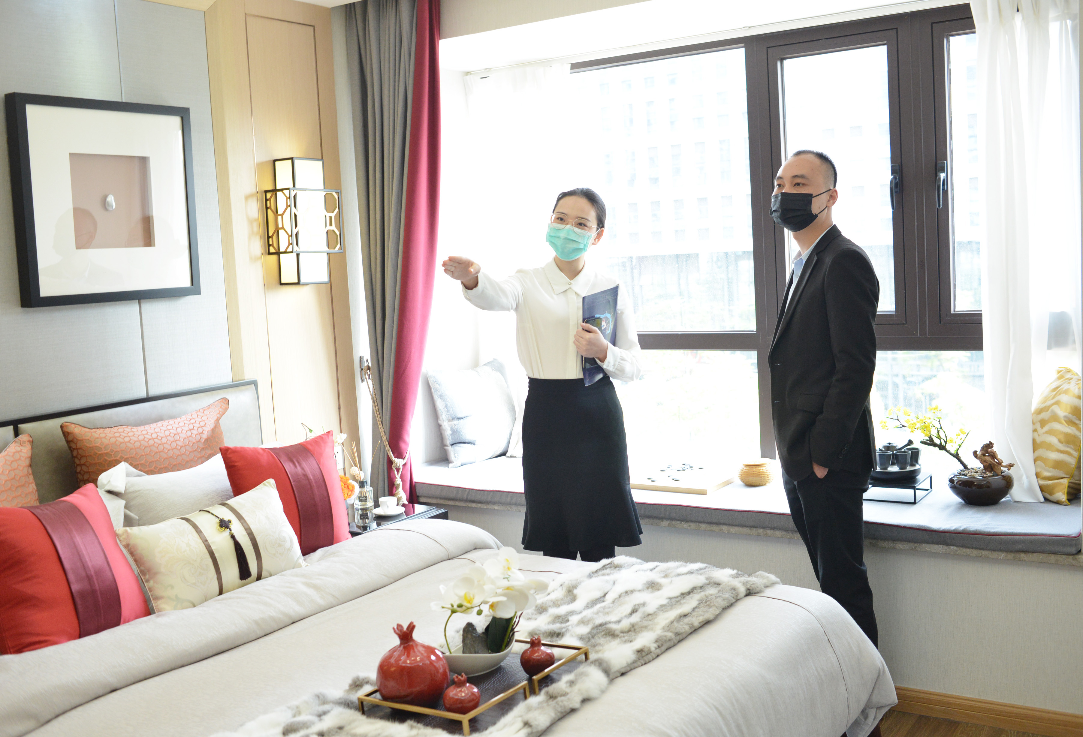 ▲华晨神农湾售楼中心工作人员在给顾客介绍样板房