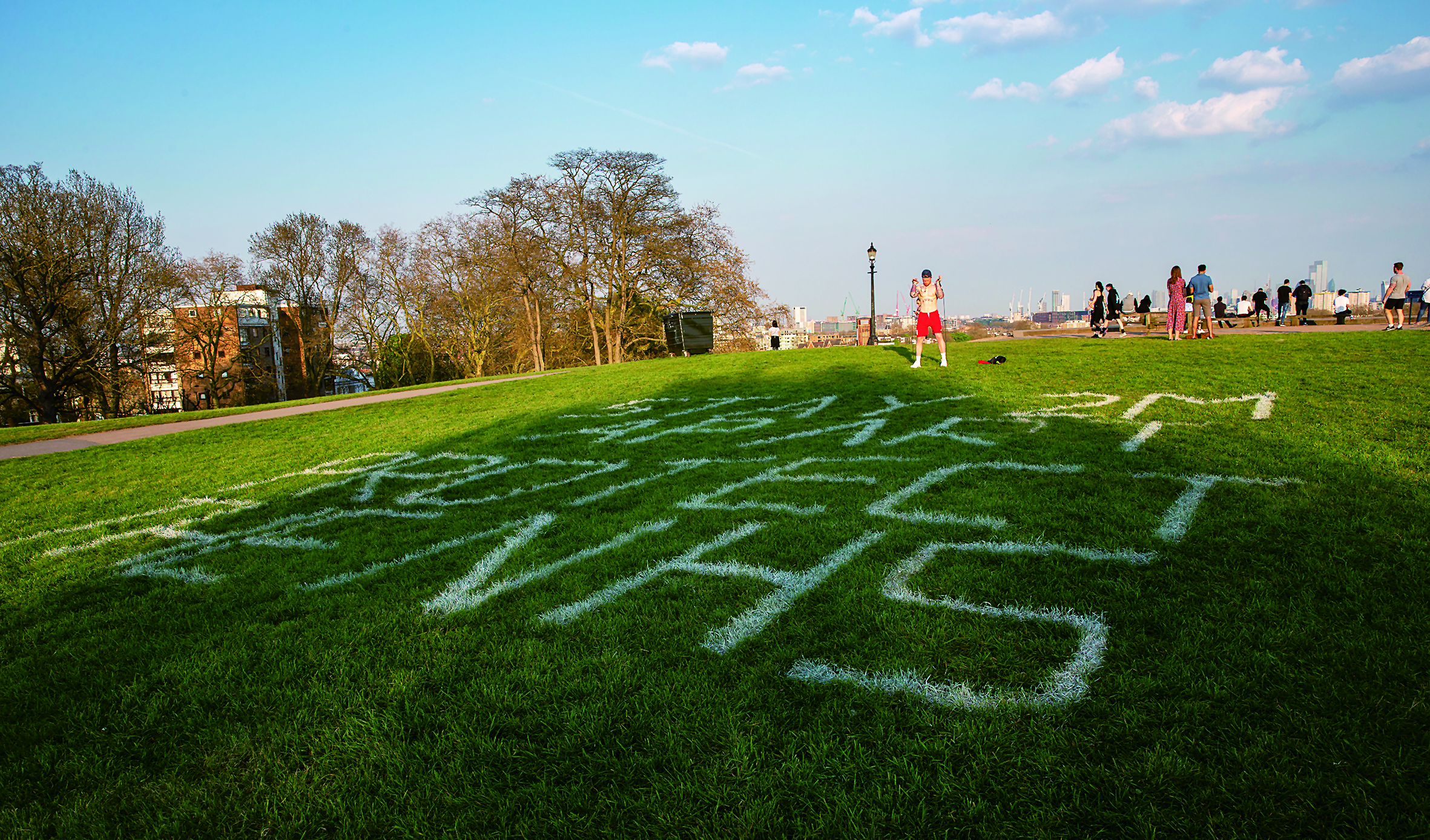 保持社交距离 4月11日,在英国伦敦,报春花山山顶的草地上印着提醒人们保持社交距离的字样“保持两米间距,保护NHS(英国国民保健制度)”。 英国卫生部4月11日发布的新冠疫情数字显示,该国累计的死亡病例数已达到9875例,与前一天的官方数字相比新增917例;累计确诊病例达到78991例。