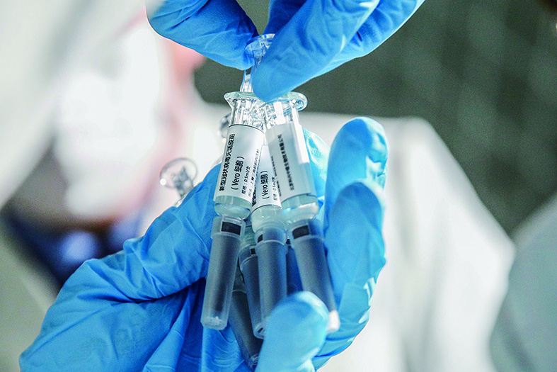 ▼3月16日,科兴中维工作人员展示新型冠状病毒灭活疫苗样品