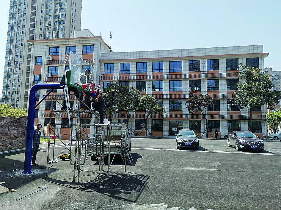 昨日上午,记者来到该校,施工人员正在操场上加紧安装篮球架。教学楼内,教师们则在忙着打扫卫生、消毒等工作,为开学做最后的准备。