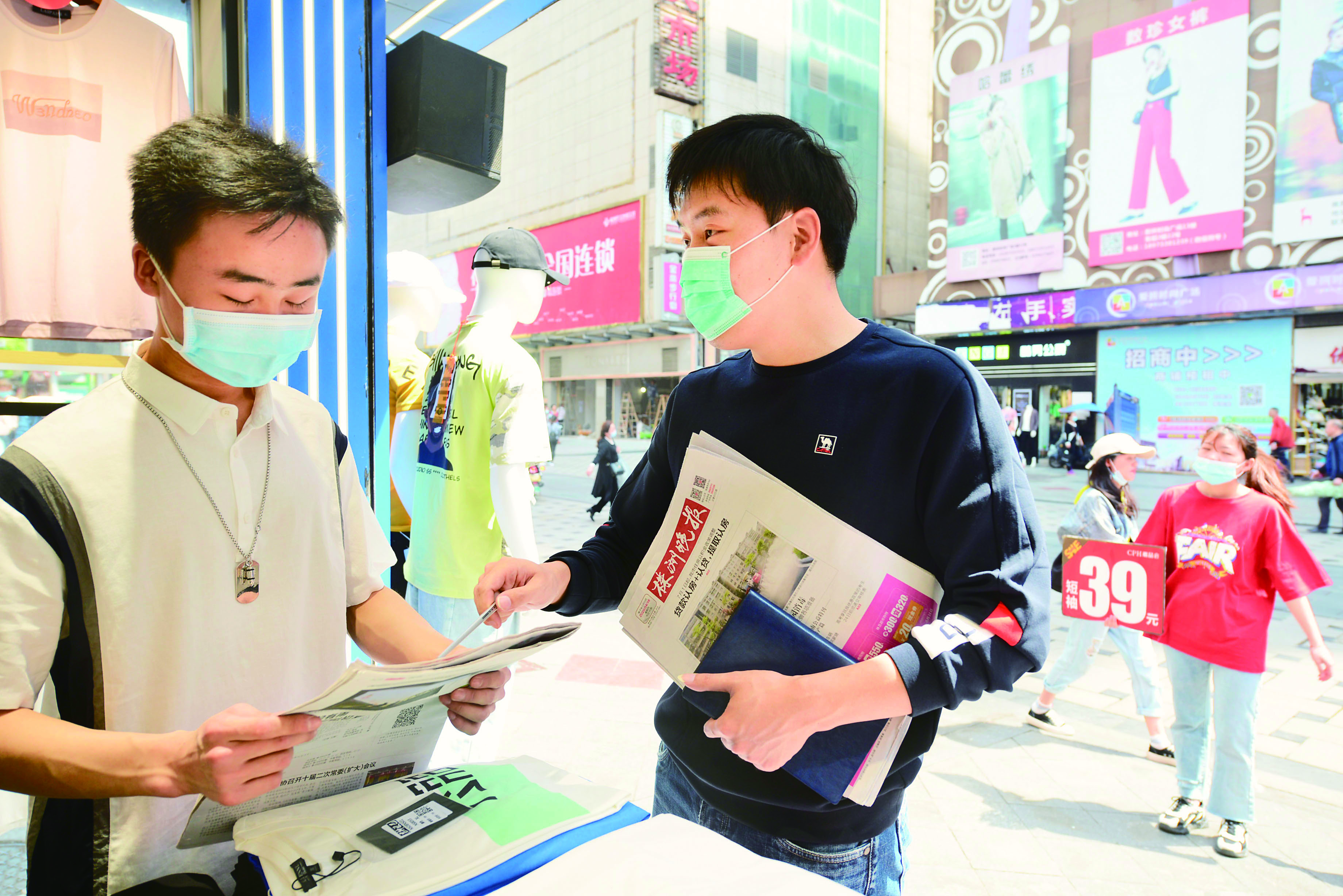 ▲昨日,芦淞市场群,晚报记者给CPH潮品会服装店经营者发送株洲晚报,并介绍晚报当天刊发的公益广告内容