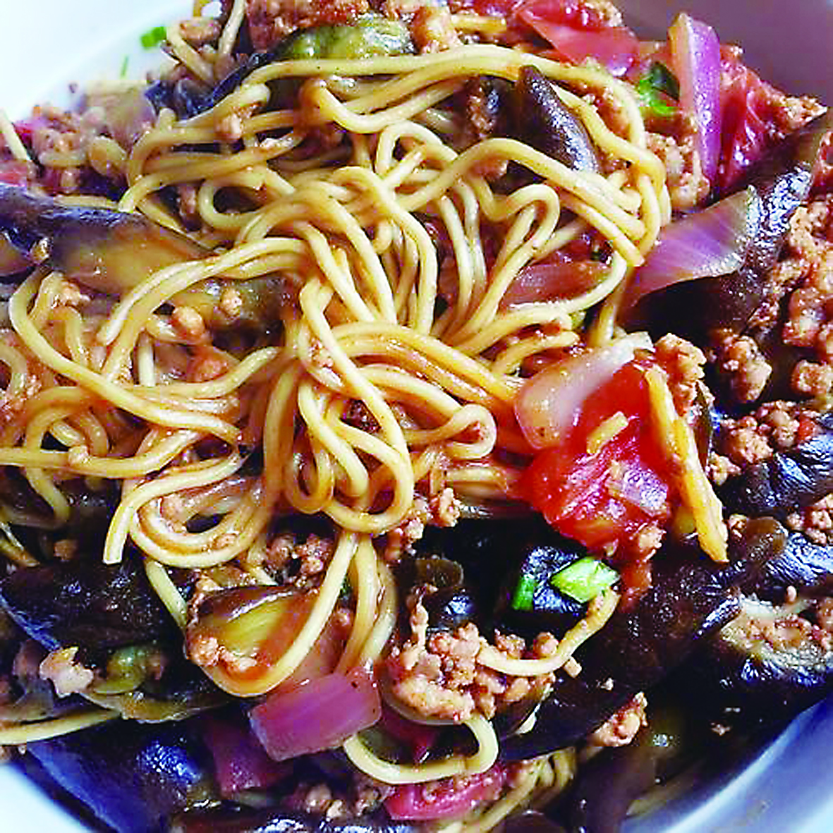把腌好的肉糜滑散至熟,沥干水的茄子倒进去,大火翻炒两三分钟,调好的料汁倒进去,转小火翻炒至茄子变软,加入没过茄子的热水。稍微收一收汁,把面放进去。