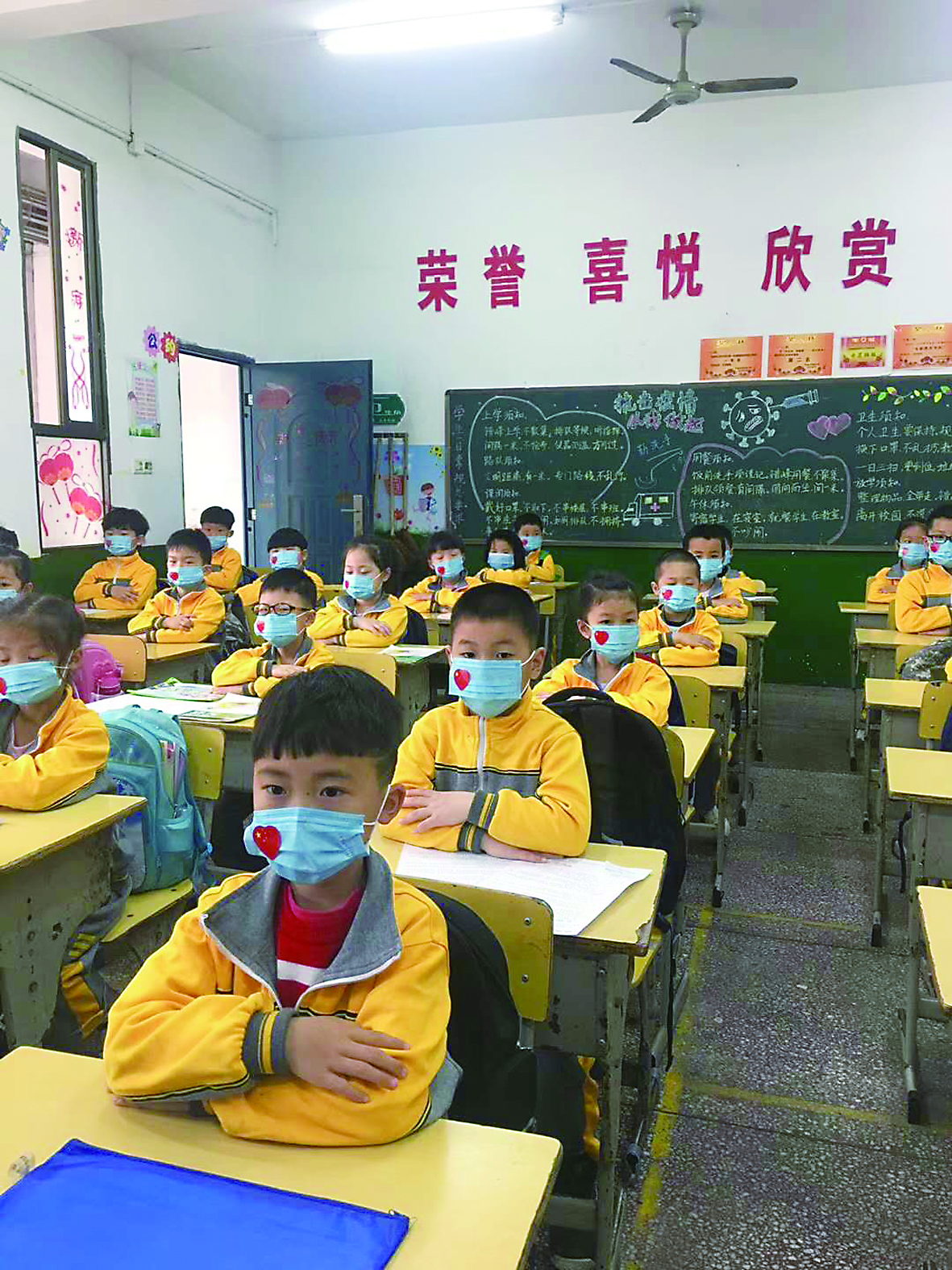 ▲昨天上午,芦淞区何家坳小学孩子们口罩上贴有“中国心” 通讯员供图