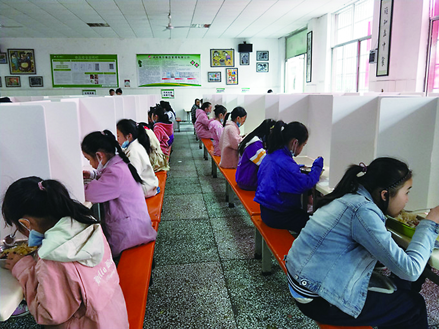 该校负责人称,在学生复学前,老师们集思广益,在网上购买了隔挡板,然后拼装成一个个“格子间”。就餐时,直接竖立在餐桌上,就餐完后就及时消毒清洗,非常方便。