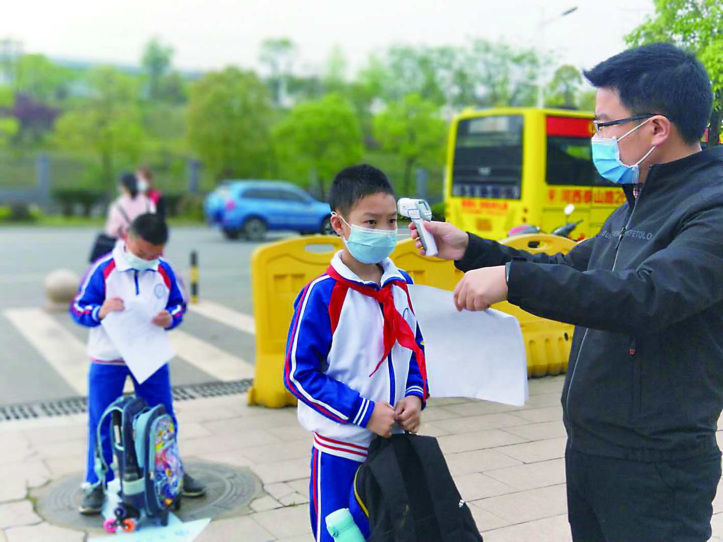 ▲昨天上午,栗雨小学孩子入校前先测量体温 记者 何春林 摄