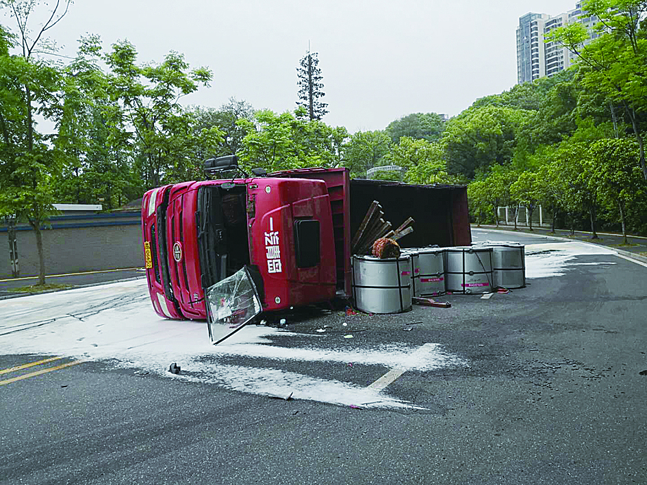货车侧翻漏油了 交警、消防及时排险 本报讯(记者 刘玺 通讯员 陈楚杰)昨日上午9时许,芦淞区沿江路,一辆货车突然侧翻,结果油箱破裂导致柴油泄漏到路面。好在芦淞交警、消防及时排险。 芦淞交警大队事故中队民警文铁娟介绍,事发后,司机从车内爬了出来,只是轻微擦伤。“由于柴油泄漏,几辆路过的摩托车打滑侧翻,但没有造成严重的伤情。”文铁娟说,为了避免二次事故继续发生,他们对事故路段实施临时交通管制。消防部门到场后,用泡沫水枪对路面进行清洗,吊车对事故货车实施起吊,事故路段的交通在11时多恢复正常。 货车司机说,他当时拖了一车冷藏板,经过事发路段时,由于是一个S型弯道,冷藏板平移导致车辆失控。他虽然进行紧急操作,但车子还是侧翻了,好在没有造成大的损失。 ▲事故现场 通讯员供图