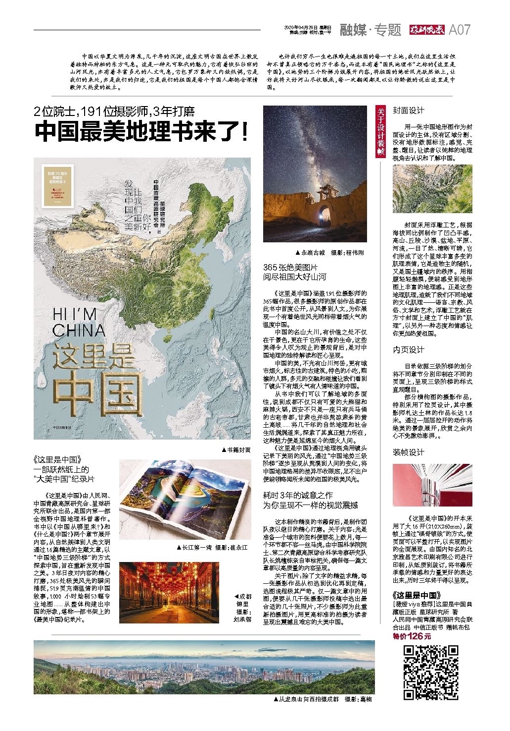 《这里是中国》由人民网、中国青藏高原研究会、星球研究所联合出品,是国内第一部全视野中国地理科普著作。书中以《中国从哪里来?》和《什么是中国?》两个章节展开内容,从自然规律到人类文明通过16篇精选的主题文章,以“中国地势三级阶梯”的方式探索中国,旨在重新发现中国之美。3年日夜对内容的精心打磨,365处极美风光的瞬间捕捉,519页充满温情的中国故事,1000 小时绘制53幅专业地图......从整体构建出中国的形象,堪称一部书架上的《最美中国》纪录片。 ▲长江第一湾 摄影:崔永江
