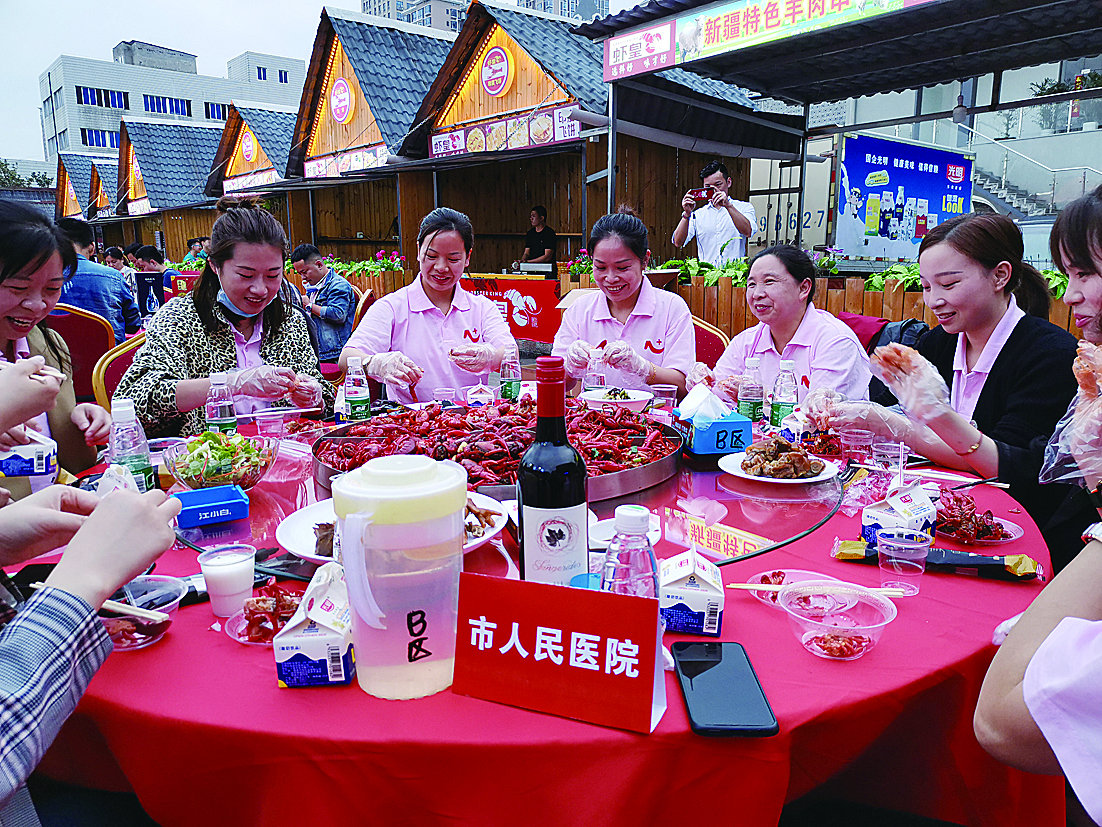 你护卫我家乡 我请你吃龙虾 4月25日晚,位于天元区黄山路附近的虾皇餐馆老板陈先生,宴请株洲援鄂医疗队医护人员吃龙虾,有60多名来自全市各医院的医护人员赴宴。陈先生是湖北荆州人,在株洲经营餐饮,此举是为了感谢株洲援鄂医疗队为湖北黄冈阻击新冠肺炎疫情作出的巨大贡献。 (记者 姚时美 摄影报道)