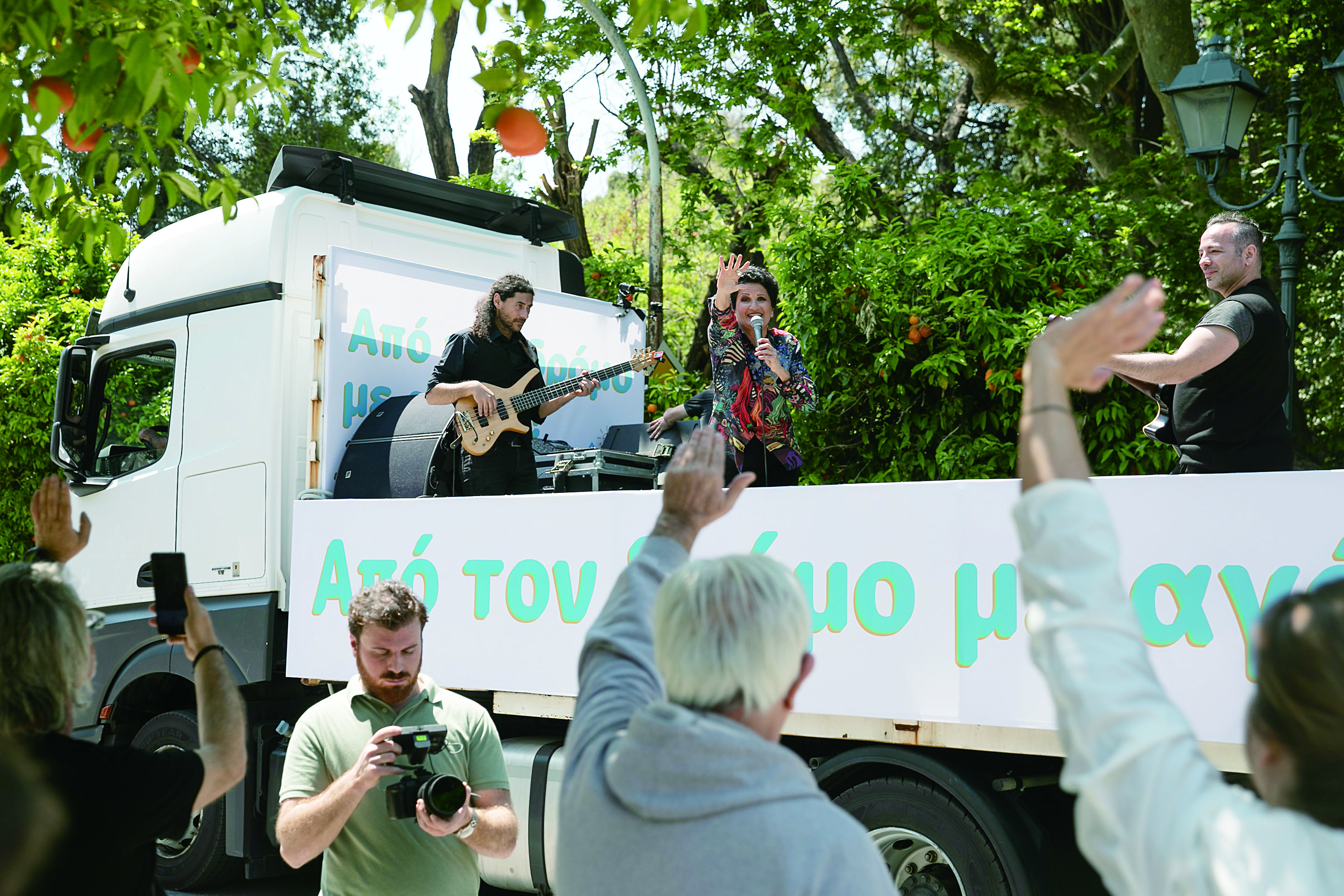 4月25日,在希腊雅典,希腊歌唱家阿尔基斯蒂斯·普罗托普萨尔蒂(中)及其乐队带来“卡车音乐会”。