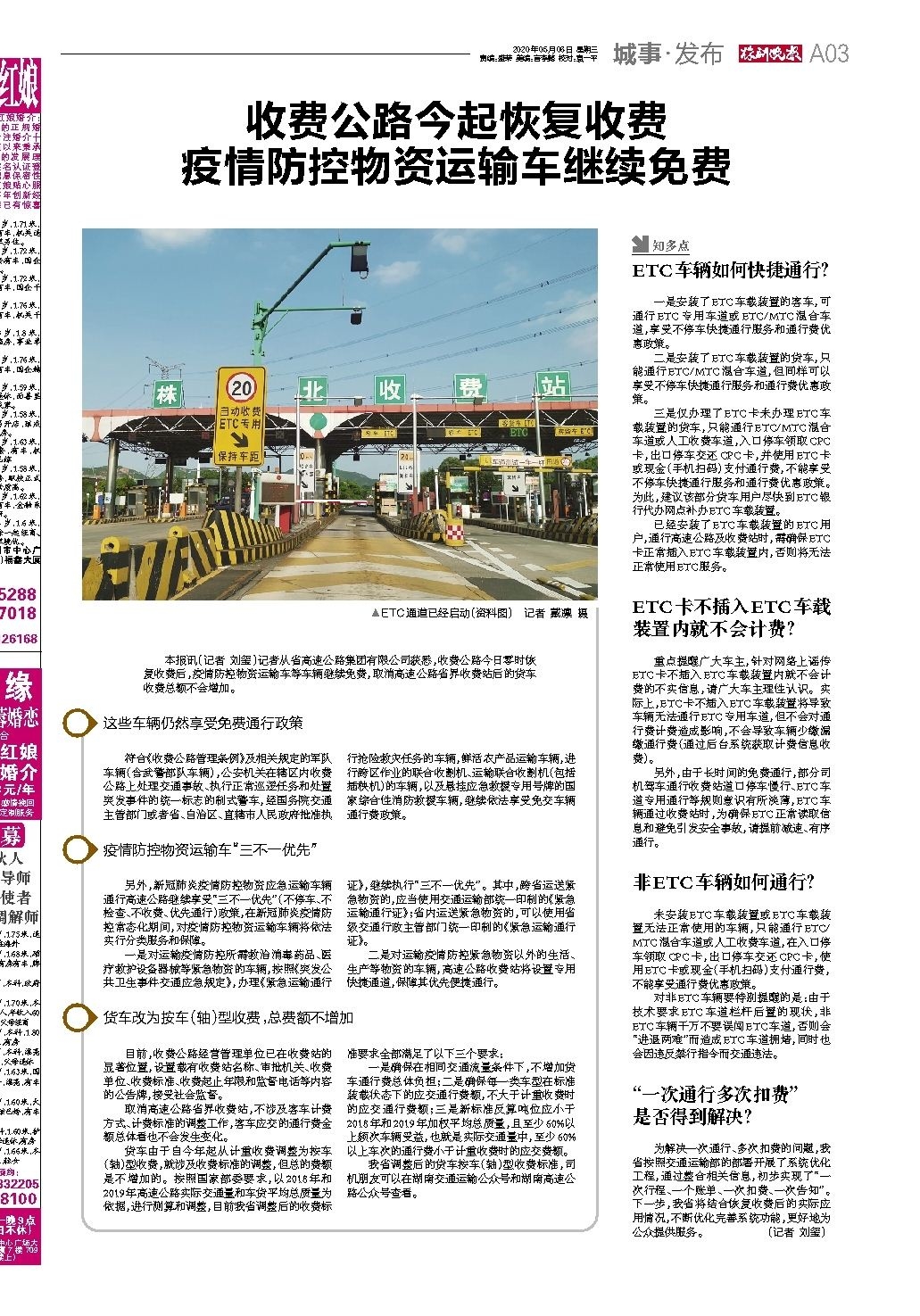 收费公路今起恢复收费 疫情防控物资运输车继续免费