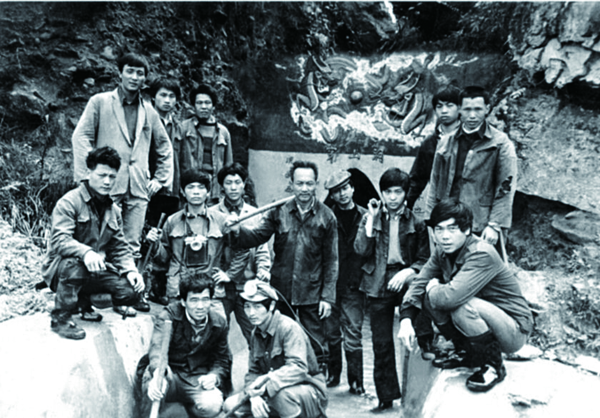 ▲过德生(扛铁锤者)与工程队部分人员在石洞通水前合影 颜家连 摄