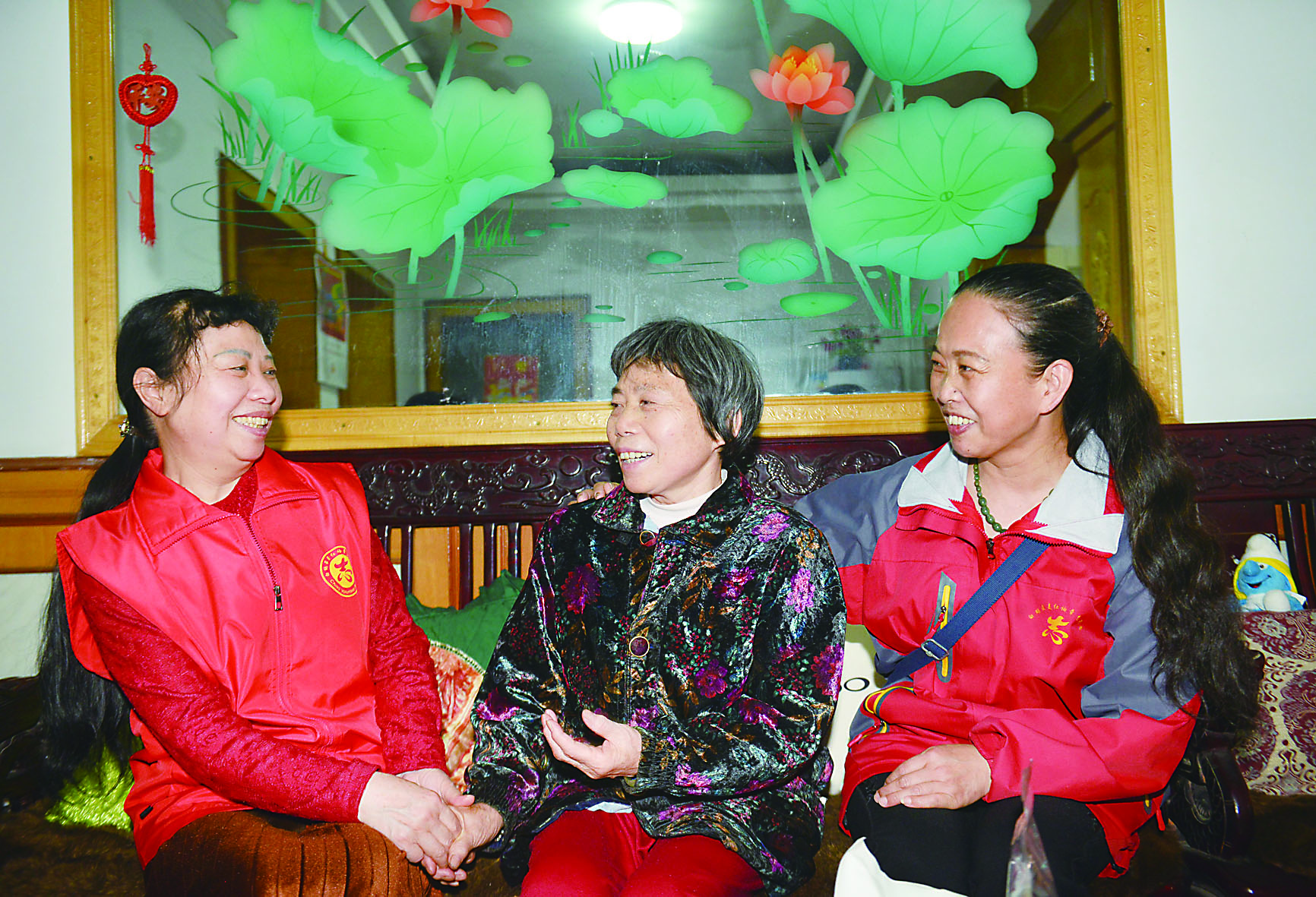 ▲志愿者朱传桂(左一)和胡伍秀(右一)在刘金玉(中间)老人家里陪她聊天
