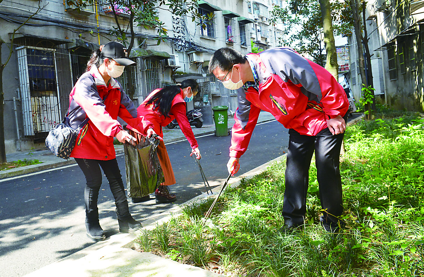 ▲志愿服务队队长谭利平(右一)和队员在清理绿化带上的垃圾