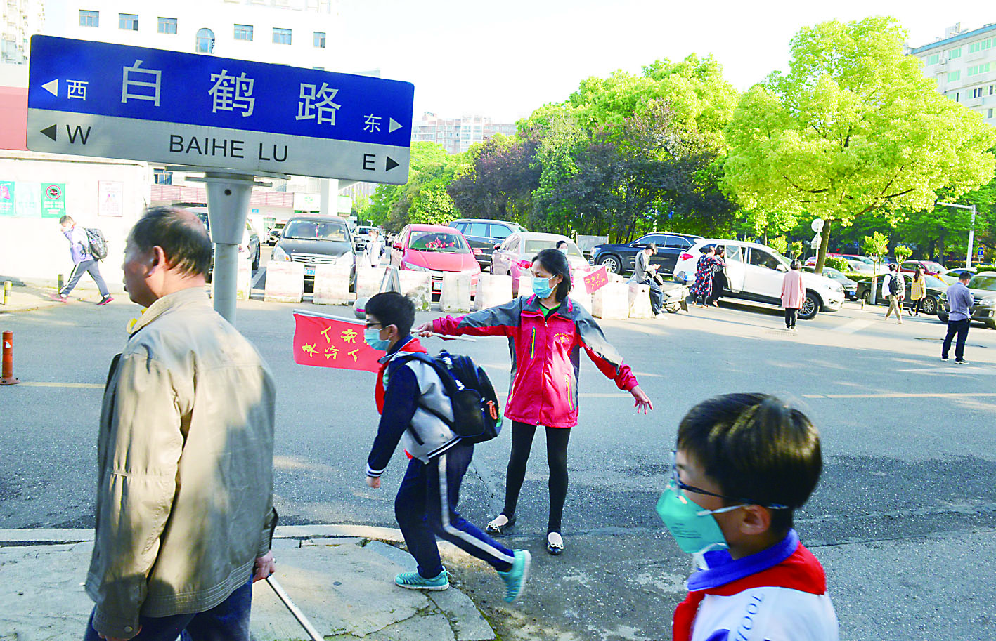 每天早上7点30,白鹤路护学岗上的志愿者小分队就开始忙碌起来。