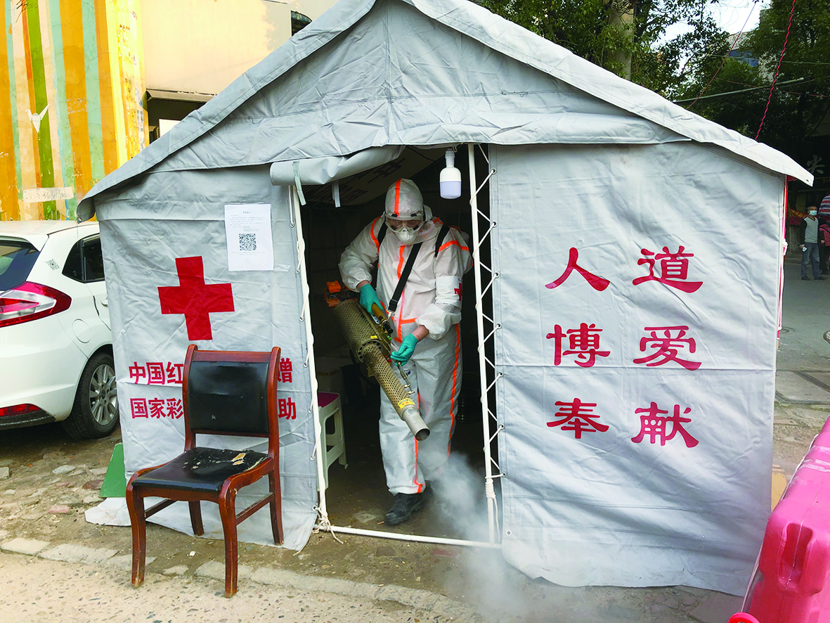 ▲红十字蓝天志愿者,对临时值守帐篷进行消杀 记者 戴凛 摄