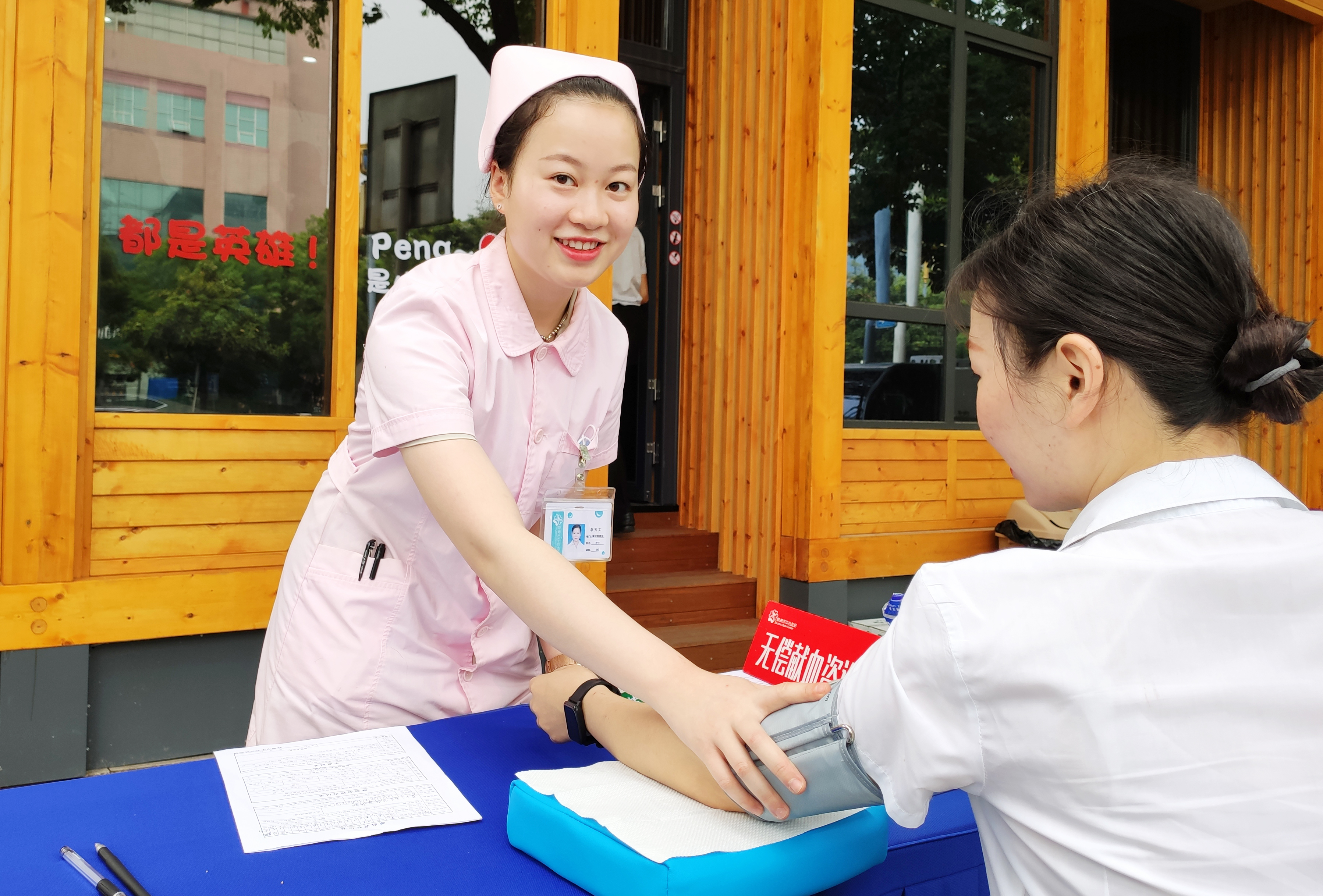 甜甜的笑,缓解献血者的紧张