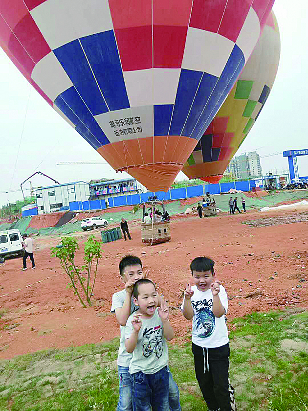 我和小伙伴体验乘坐热气球,在空中俯视地面,从另一个角度欣赏了祖国山河的壮美! 光明学校一(5)班 吴鑫龙(右)