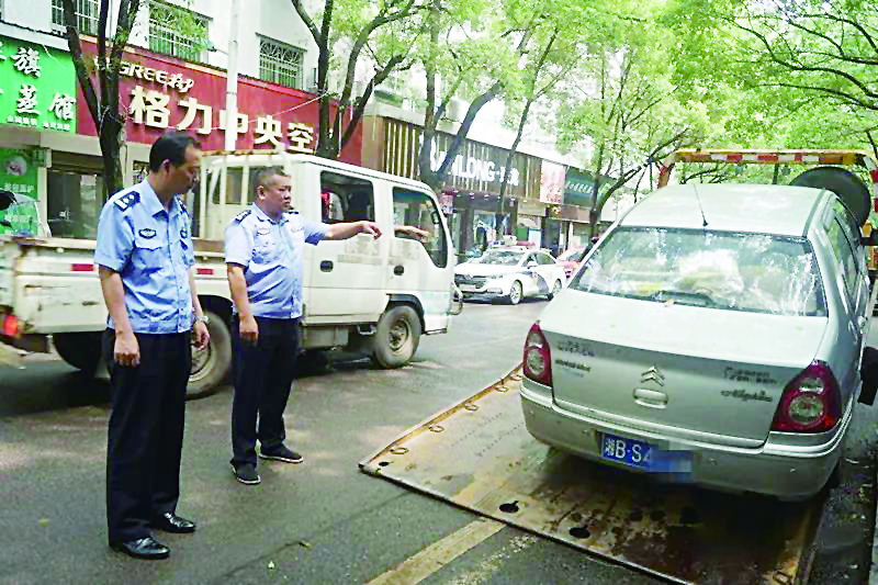 ▲在交警监督下,“僵尸车”被拖离 通讯员 供图