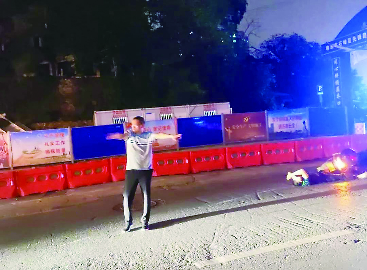 事发地点位于闹市马路,来来往往的车辆很多,晚上视线又不好,喻先生担心过往的车辆碾压到伤者。于是,他“客串”起交警,指挥车辆注意避让。