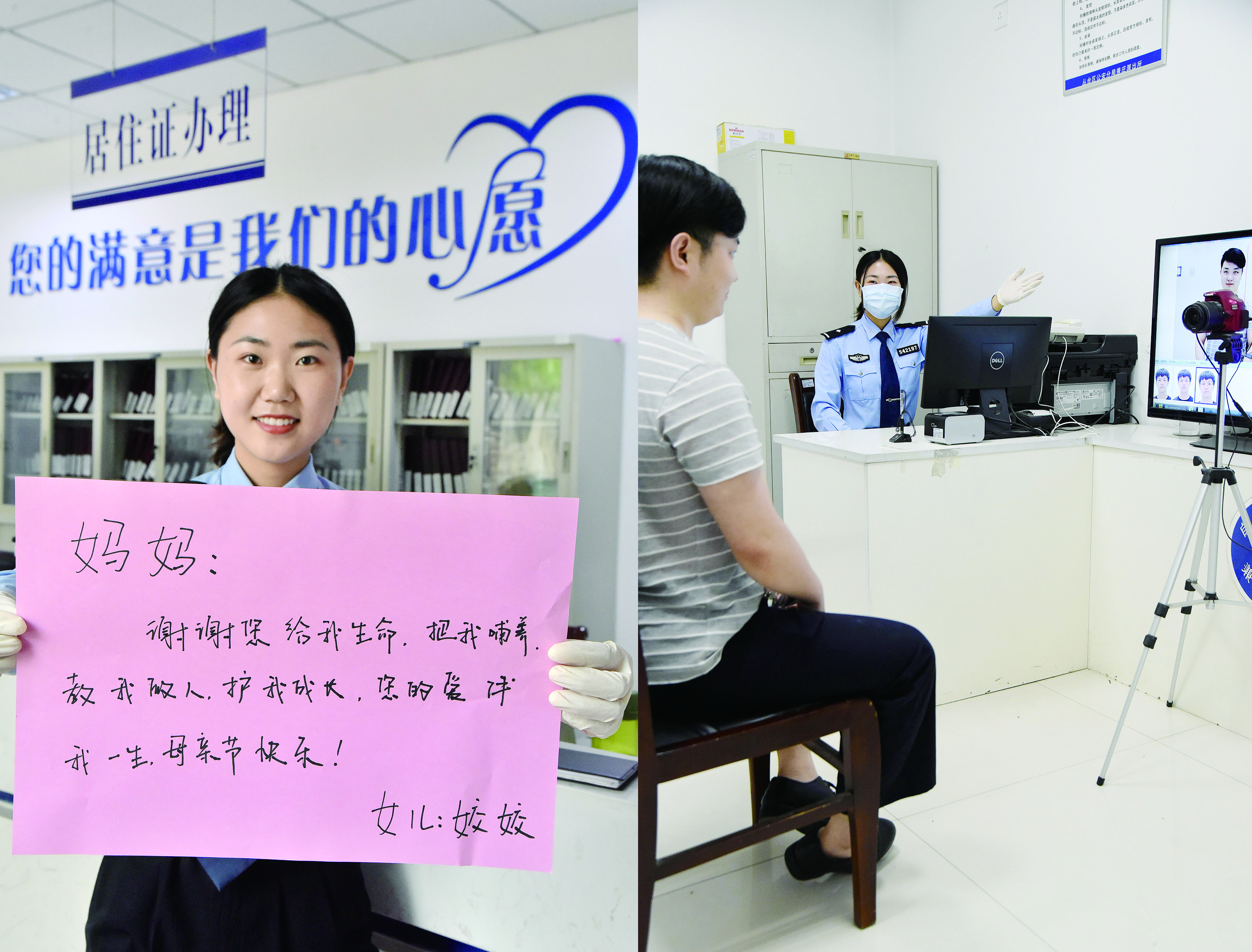 妈妈,我想对您说 昨天是母亲节,河北省邯郸市不同行业的工作人员为母亲送上温馨的祝福,表达对母亲的爱。 这张拼版照片显示的是:河北省邯郸市公安局丛台分局兼庄派出所户籍民警宋鹏姣为在河北邢台的母亲送上祝福(左);宋鹏姣在给居民办理居民身份证(右)。 (据新华社)