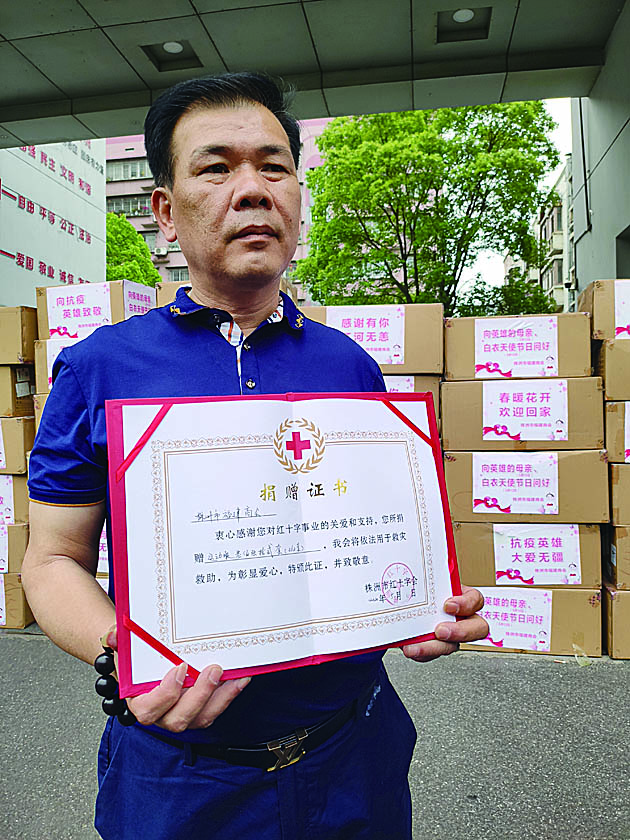 株洲市福建商会 为抗疫英雄捐“运动大礼包” 本报讯(记者 杨凌凌 通讯员 朱卫健)5月11日上午,在株洲市卫健委举行了一场简单的捐赠仪式。为了能够在后疫情时代帮助广大医务人员强身健体,株洲市福建商会发起了捐赠活动,向全市362名抗疫一线医务人员赠送了总价值41.23万元的定制运动服和运动鞋。 副市长杨胜跃代表市委、市政府向株洲市福建商会表示感谢,称赞他们的举动心意浓浓、爱心满满。他希望每位医务人员珍惜商会的心意,努力工作,继续在抗击疫情的斗争中发挥主力军的作用,取得抗击新冠肺炎疫情的最后胜利。 株洲市福建商会会长丁玉赤表示,疫情期间,医护人员舍生忘死,保卫了无数民众的健康,他们是闽商学习的榜样。希望每位医务人员在抗击疫情辛苦工作之余,多多锻炼,保重身体。 ◀株洲市福建商会秘书长吴明辉接受捐赠证书 记者 杨凌凌 摄